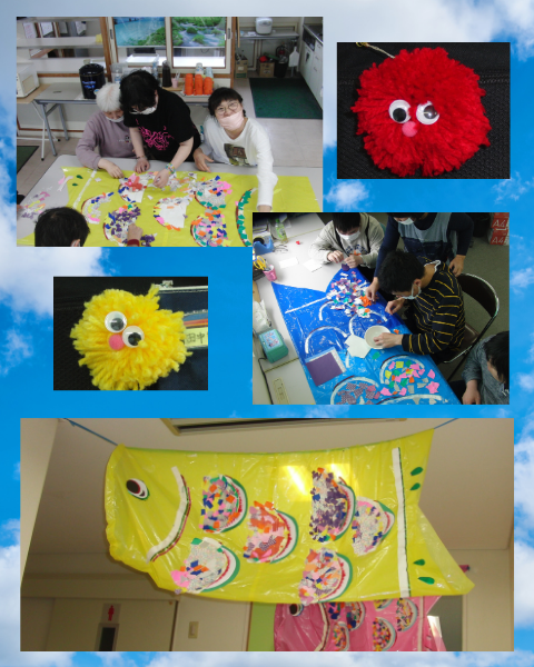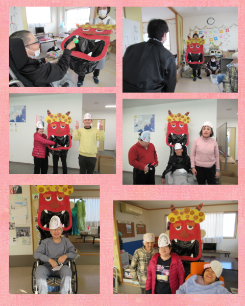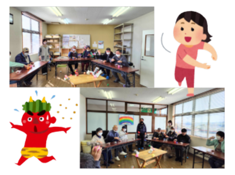 ペットボトルに鬼お面付けて、新聞紙を丸めて折り紙を貼って豆を作り